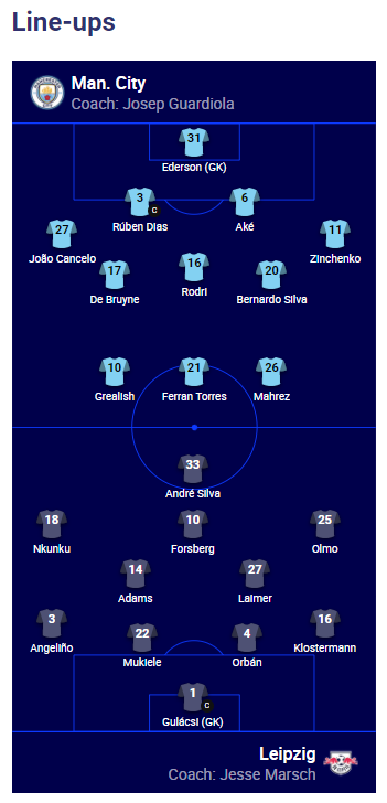- Trận đấu: Man City vs RB Leipzig (Cúp C1 Châu Âu)