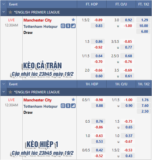 * Chốt kèo trận Man City vs Tottenham (00h30 ngày 20/02)