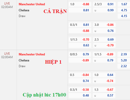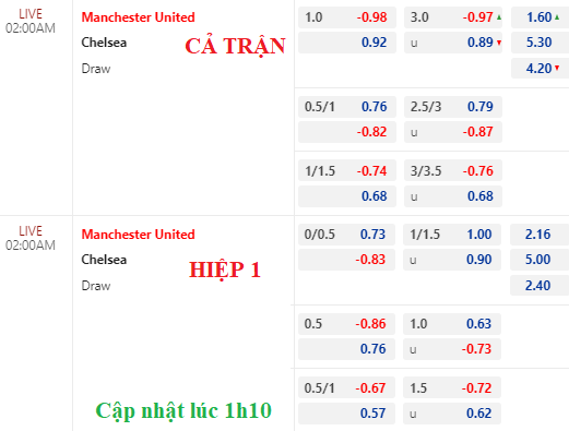 Sàn châu Á ghi nhận việc MU tăng giá khi kèo chấp 1 hòa của họ có điểm ăn tiến gần đến mức đủ. Tài xỉu 2 3/4 cũng có xu hướng nhích lên thành 3 hòa. Chelsea hết động lực và vẫn rất thất thường, đội hình xuất phát của họ phần lớn là các cầu thủ có phong độ không tốt.