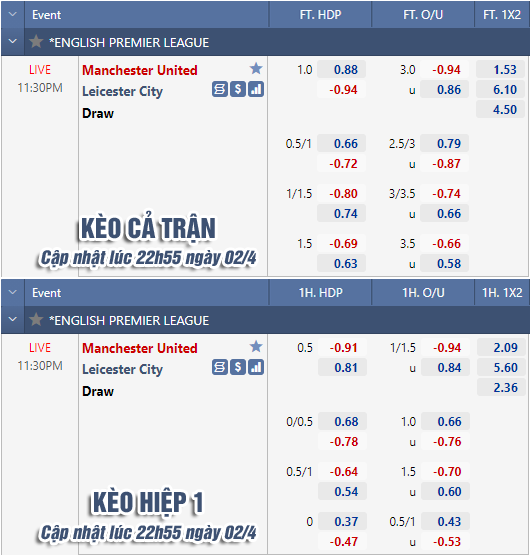 * Chốt kèo trận Man Utd vs Leicester City (23h30 ngày 02/04)