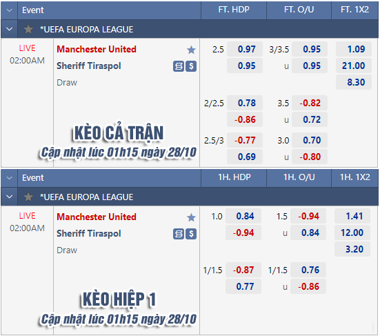 * Chốt kèo trận Man Utd vs Sheriff Tiraspol (02h00 ngày 28/10)
