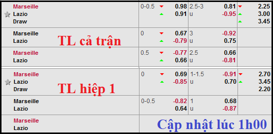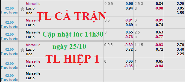 Không còn nghi ngờ gì nữa, đây là trận đấu được chờ đợi hấp dẫn và tưng bừng. Cả Marseille và Lazio đều cần phải thắng bởi ở bảng này, Eintracht Frankfurt đang có lợi thế lớn và đẩy hai đội bóng này vào thế buộc phải loại nhau. Kèo tài xỉu 2 3/4 vẫn được duy trì nhưng giá ăn có giảm đôi chút (cửa tài sáng hơn).