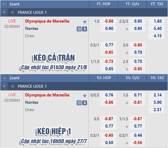 * Chốt kèo trận Marseille vs Nantes (02h00 ngày 21/08)