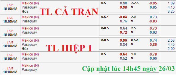 AEGoal.net chốt kèo trực tiếp trận Mexico vs Paraguay diễn ra lúc 09h00 ngày 27/03 sau khi dựa trên tính toán, chuyển động về kèo châu Á và đội hình ra sân của 2 đội.