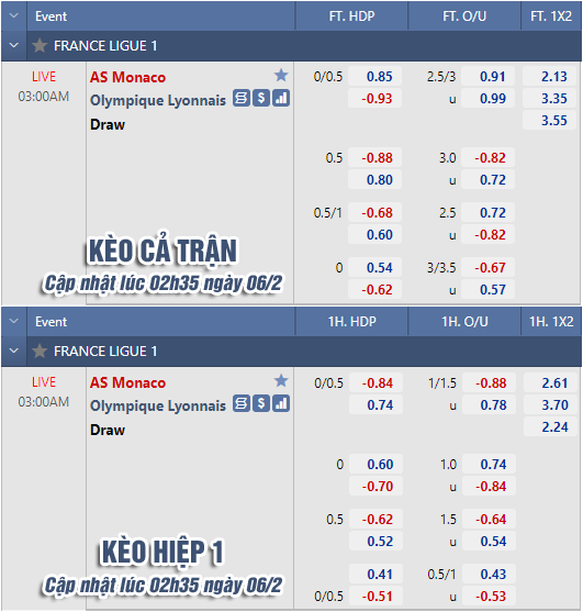 * Chốt kèo trận Monaco vs Lyon (03h00 ngày 06/02)