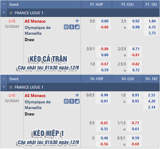 * Chốt kèo trận Monaco vs Marseille (02h00 ngày 12/9)