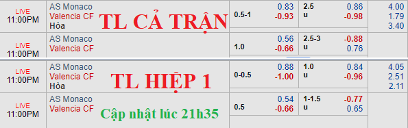 Nếu như đầu giờ chiều nay Valencia chỉ chấp hòa thì trước giờ bóng lăn chừng 30 phút, tỷ lệ chính đã lên mức Valencia chấp 3/4 với điểm bỏ cho cửa trên. Trong khi handicap tăng theo chiều hướng tích cực với cửa trên thì mốc tài xỉu bất ngờ bị điều chỉnh về mức 2 1/2 (lúc chiều là 2 3/4).