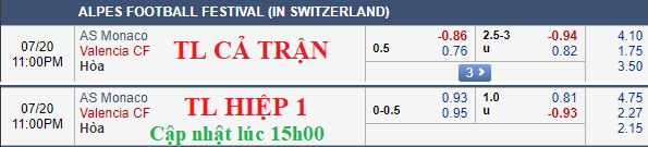 AEGoal.net chốt kèo trực tiếp trận Monaco vs Valencia diễn ra lúc 22h00 ngày 20/7 sau khi dựa trên tính toán, chuyển động về kèo châu Á và đội hình ra sân của 2 đội.