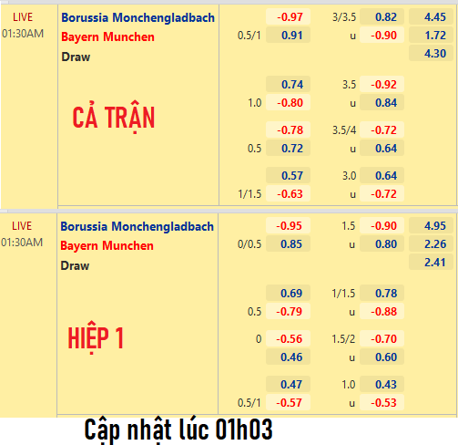 Nếu như đầu phiên chứng kiến Bayern Munich chấp 1 òa cùng điểm lợi nhuận thấp hơn chiều ngược lại thì đến khi trận đấu chuẩn bị diễn ra, chỉ số chính bị đưa về mốc Bayern Munich chấp 3/4. Cùng với đó là chỉ số Tài-Xỉu 3 3/4 đã bị thay thế bằng kèo chính theo bàn thắng 3 1/2. Do đó, các chuyên gia đều có những quan điểm tích cực hơn dành cho đội chủ nhà.