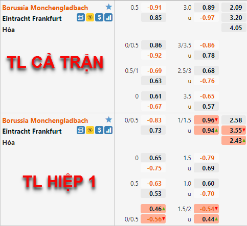 Tỷ lệ chấp của đội chủ nhà gần như không có biến động nào đáng kể so với thời điểm chúng tôi cập nhật trưa nay. Monchengladbach vẫn được duy trì tỷ lệ chấp chính ở mức 1/2 và điểm ăn gần như không có thay đổi. Trong khi đó tỷ lệ tài xỉu có những biến động rõ ràng khi mốc 3 hoà đã được đẩy lên làm mốc chính của trận đấu thay cho mức 2 3/4 trước đây.