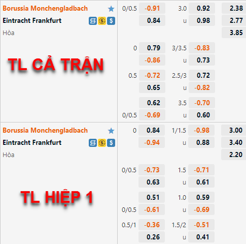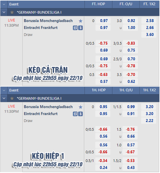 * Chốt kèo trận M'gladbach vs Ein. Frankfurt (23h30 ngày 22/10)