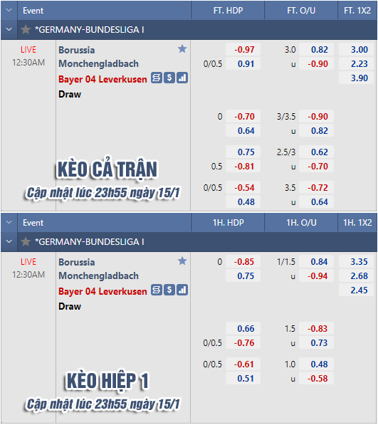 * Chốt kèo trận Monchengladbach vs Leverkusen (00h30 ngày 16/1)