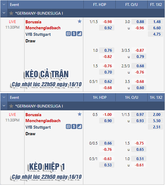 * Chốt kèo trận M'gladbach vs Stuttgart (23h30 ngày 16/10)