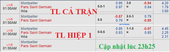 So với đầu giờ chiều nay (30/04) thì tỷ lệ chính đã dịch chuyển từ mức PSG chấp hòa lên thành 3/4 với điểm ăn tương đối cân bằng cho 2 cửa. Trong khi đó, mốc tài xỉu 2 3/4 cũng được kéo lên thành 3 hòa. Đây là tín hiệu khá bất ngờ bởi PSG đã hết động lực do đã chắc chắn vô địch trong khi Montpellier vẫn còn hy vọng bắt kịp top 4.