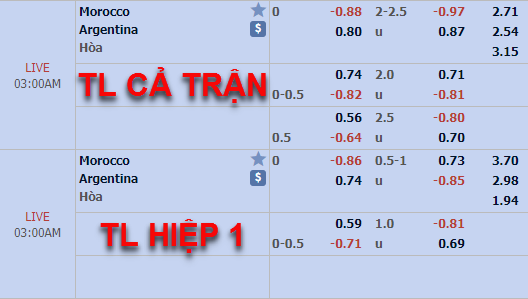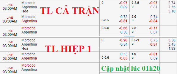 Nếu so với phiên khớp lệnh 08h00 sáng ngày 26/03 thì Argentina tiếp tục mất giá khi điểm ăn 0.80 ở kèo hòa-được-thua của họ tăng lên thành 0.89. Trong khi lợi nhuận cho 2 cửa ở mức handicap thay đổi thì mốc tài xỉu không hề có dịch chuyển, kể cả về điểm ăn. Sự biến động như vậy về tỷ lệ là tín hiệu bi quan với Argentina.