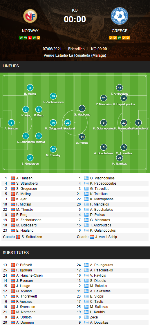 AEGoal chốt kèo bóng đá trực tiếp trận Na Uy vs Hy Lạp diễn ra lúc 00h00 ngày 07/06 trong khuôn khổ giao hữu quốc tế sau khi dựa trên tính toán, chuyển động về kèo châu Á và đội hình ra sân của 2 đội.
