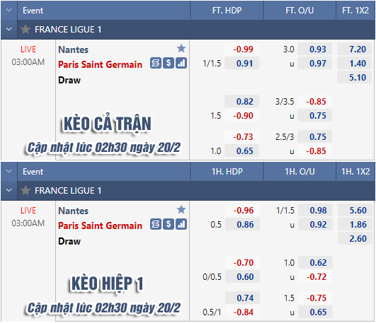 AEGoal chốt kèo bóng đá trực tiếp trận Nantes vs PSG diễn ra lúc 03h00 ngày 20/2 trong khuôn khổ giải VĐQG Pháp sau khi dựa trên tính toán, chuyển động về kèo châu Á và đội hình ra sân của 2 đội.