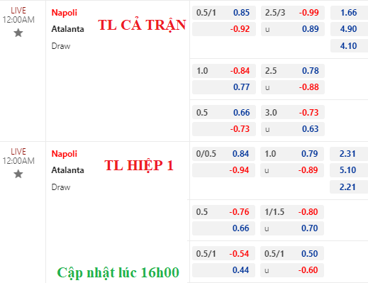 Trên sàn châu Á, Napoli vẫn chấp 3/4 nhưng điểm ăn cho họ có tăng nhẹ. Đáng nói là tài xỉu 2 3/4 lại bị kéo về còn 2 1/2 với lợi nhuận không chênh lệch là bao giữa 2 cửa. Dịch chuyển như vậy cùng với việc Atalanta thận trọng thì trận này khó tưng bừng.
