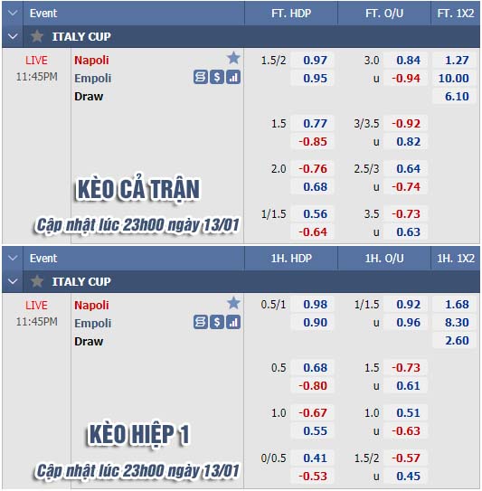 * Chốt kèo trận Napoli vs Empoli (23h45 ngày 13/01)