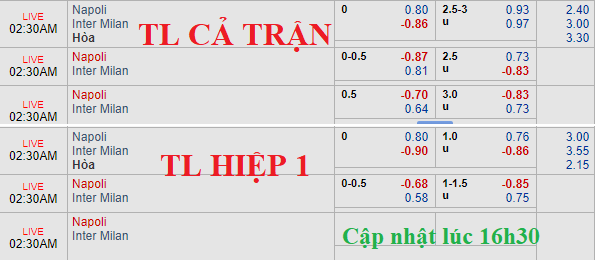 So với thời điểm chiều nay, kèo trận đấu giữa Napoli và Inter Milan đã nhích nhẹ từ 0:0 lên 0:1/4, cho thấy các nhà đầu tư đang hướng sự chú ý đến chủ nhà Napoli. Trong trận đấu sớm, AC Milan đã không quá khó khăn giành thắng lợi trước Frosinone và tiến sát đến Inter (chỉ còn kém 1 điểm).