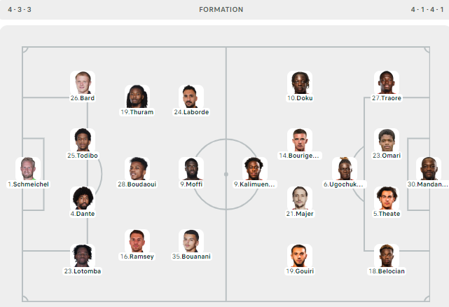 Đôi bên đều có những nhân tố đã từng khẳng định được bản thân như A.Ramsey, Dante, Schmeichel (Nice) hay Gouiri, Doku (Rennes). Nếu như chủ chơi với sơ đồ 4-3-3 thì các vị khách lựa chọn chiến thuật 4-1-4-1.