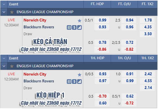 * Chốt kèo trận Norwich City vs Blackburn Rovers (00h30 ngày 18/12)