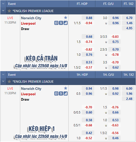 AEGoal chốt kèo bóng đá trực tiếp trận Norwich vs Liverpool diễn ra lúc 23h30 ngày 14/8 trong khuôn khổ giải Ngoại hạng Anh sau khi dựa trên tính toán, chuyển động về kèo châu Á và đội hình ra sân của 2 đội.