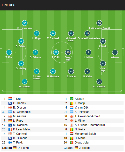 Trong đội hình ra sân của Liverpool ở trận này, không có nhiều bất ngờ xảy ra bởi những cái tên có mặt đều là những cầu thủ đang có phong độ cũng như thể lực tốt nhất. Trong khi bên phía Norwich, dù không có sự thiếu vắng nào quá lớn nhưng so với Liverpool rõ ràng là có 1 sự chênh lệch lớn về trình độ.