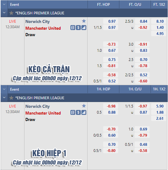 AEGoal chốt kèo bóng đá trực tiếp trận Norwich vs Man Utd diễn ra lúc 00h30 ngày 12/12 trong khuôn khổ giải Ngoại hạng Anh sau khi dựa trên tính toán, chuyển động về kèo châu Á và đội hình ra sân của 2 đội.