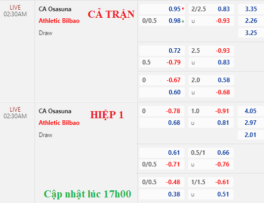 AEGoal chốt kèo bóng đá trực tiếp trận Osasuna vs Bilbao diễn ra lúc 02h30 ngày 26/05/2023 trong khuôn khổ giải VĐQG Tây Ban Nha sau khi dựa trên tính toán, chuyển động về kèo châu Á và đội hình ra sân của 2 đội.
