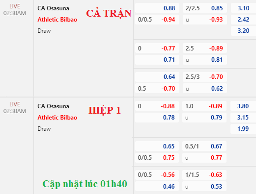 Dù đưa ra đội hình khá mạnh nhưng Bilbao thiếu đi sức bật. Kèo chấp 1/4 của họ thậm chí còn có điểm ăn bỏ sâu hơn. Trong bối cảnh tài xỉu không có dịch chuyển đáng kể thì handicap như vậy là chưa khả quan với Bilbao.