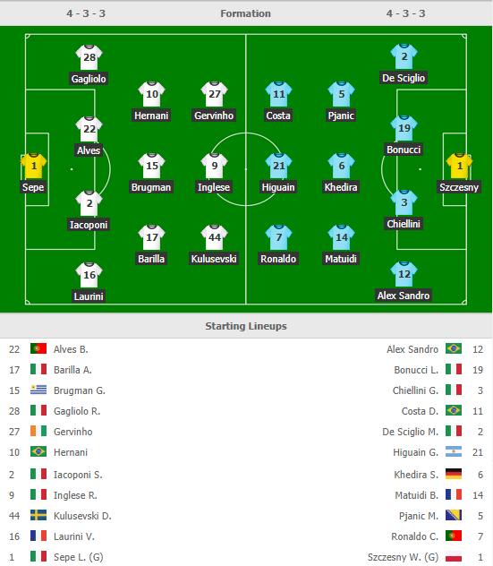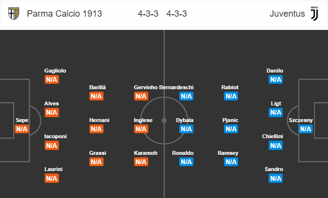 HLV Sarri tung vào sân đội hình rất mạnh với những ngôi sao tấn công hàng đầu như Ronaldo, Higuain, Douglas Costa. Trong khi đó, Parma cũng có những quân bài chủ chốt như Gervinho, Inglese. Cả 2 đội đều chơi với sơ đồ thiên về tấn công là 4-3-3. Điều này khiến nhiều người nghĩ đến 1 kịch bản cởi mở.