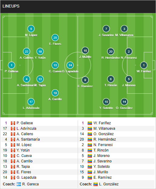 Peru: Gallese; Lopez, Callens, Santamaria, Advincula; Tapia, Yotun, Cueva; Carrillo, Flores, Lapadula