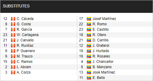 Trái với nhiều sự thay đổi trong đội hình của Venezuela thi Peru chỉ có 1 sự thay đổi trên hàng công khi lão tướng Paolo Guerrero nhường chỗ cho Lapadula. Tuy vậy, so với đối thủ, đây vẫn là lực lượng có thể giúp Peru tạo ra sự áp đảo.