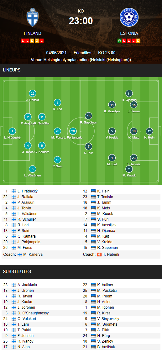 AEGoal chốt kèo bóng đá trực tiếp trận Phần Lan vs Estonia diễn ra lúc 23h00 ngày 04/6 trong khuôn khổ giao hữu quốc tế sau khi dựa trên tính toán, chuyển động về kèo châu Á và đội hình ra sân của 2 đội.