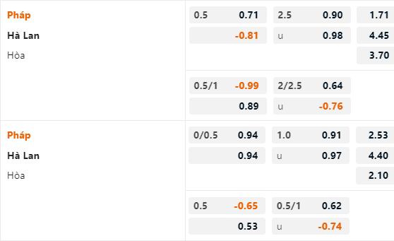 Có khá nhiều cái tên còn xa lạ trong đội hình xuất phát của Hà Lan đã khiến họ sụt giảm đáng kể trên sàn giao dịch châu Á. Kèo chính Pháp chấp 3/4 đã chứng kiến đội khách xuống bỏ rất sâu vào thời điểm bóng chuẩn bị lăn. Tuy nhiên, đây là điều dễ hiểu khi giá trị đội hình của Pháp tạo ra lúc này quá lớn và họ còn được đá trên sân nhà nên làn sóng trên thị trường tăng đáng kể là hoàn toàn phù hợp.