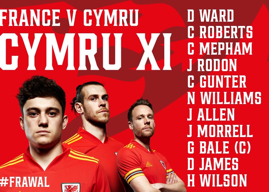 Wales (3-4-3): Danny Ward; Joe Rodon, Tom Lockyer, Chris Mepham; Chris Gunter, Aaron Ramsey, Joe Morrell, Jonny Williams; Gareth Bale, Kiefer Moore, Dan James.