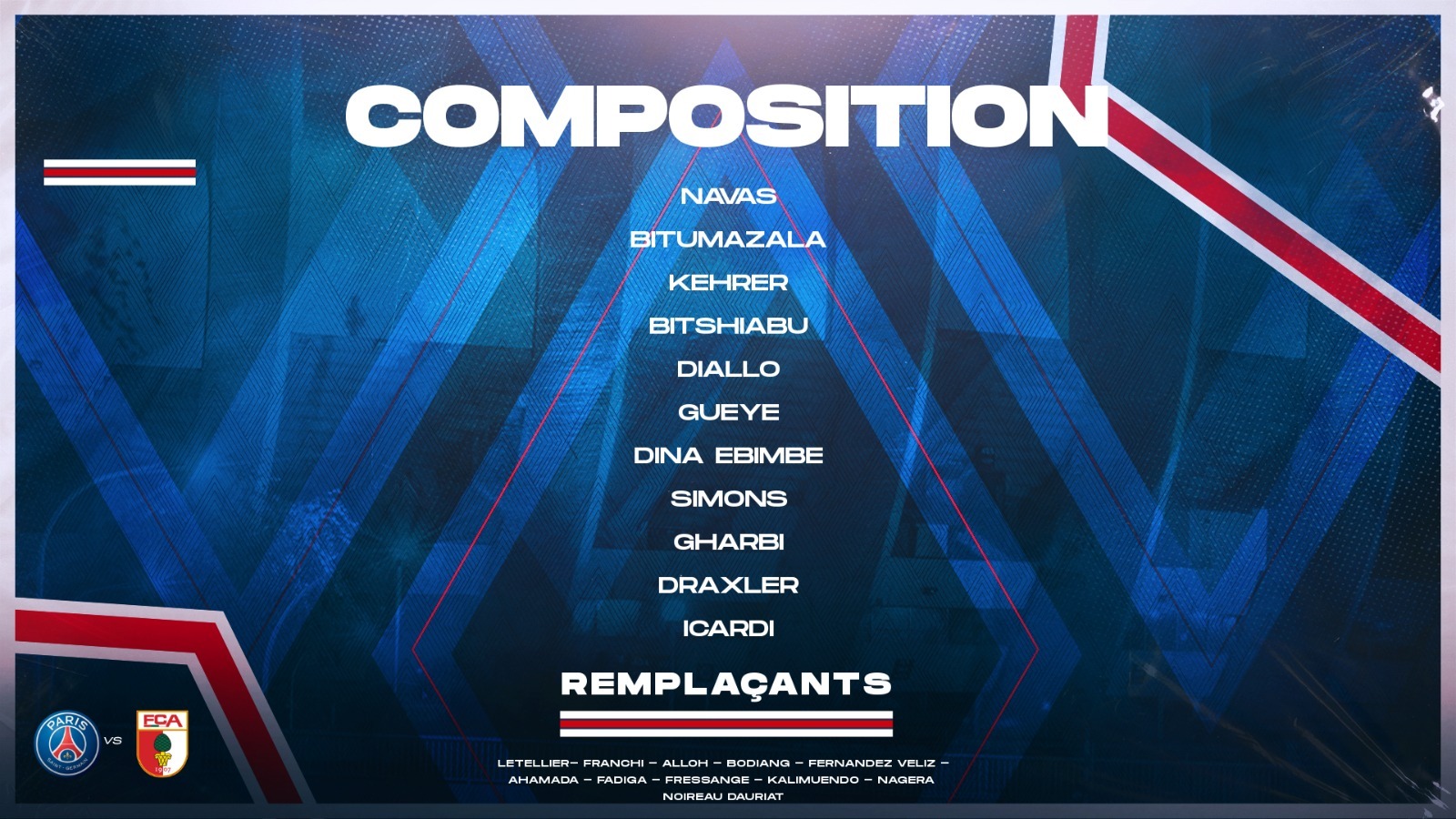 - PSG (4-4-2): Letellier - Bitumazala, Kehrer, Diallo, Kurzawa - Gharbi, Ebimbe, Gueye, Draxler - Icardi, Mvuemba
