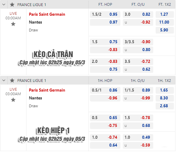 * Chốt kèo trận PSG vs Nantes (03h00 ngày 05/3)