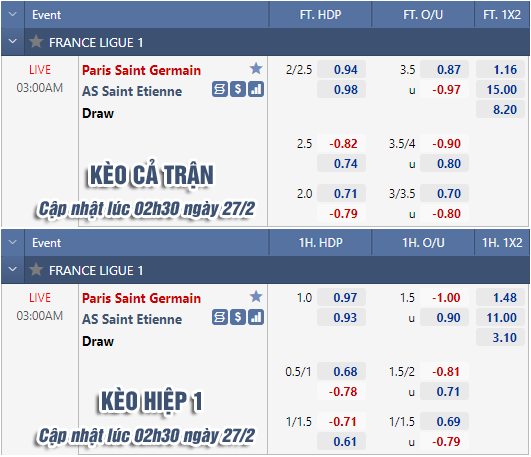* Chốt kèo trận PSG vs Saint Etienne (03h00 ngày 27/2)