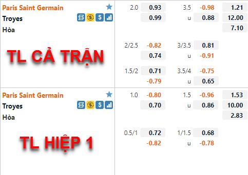 Thị trường châu Á chứng kiến đà tăng giá của PSG khi sát giờ bóng lăn thì họ lên chấp 2 1/4, kéo theo đó mốc tài xỉu 3 1/2 cũng được nâng lên thành 3 3/4 với lợi nhuận không chênh lệch là bao giữa 2 cửa.