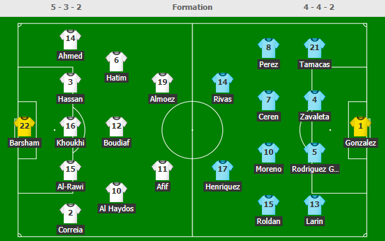 - Qatar: Barsham; Kheder, Hassan, Khoukhi, Ro-Ro, Salman; Hatem, Boudiaf, Al Haydos; Ali, Afif.