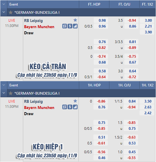 AEGoal chốt kèo bóng đá trực tiếp trận RB Leipzig vs Bayern Munich diễn ra lúc 23h30 ngày 11/9 trong khuôn khổ giải VĐQG Đức sau khi dựa trên tính toán, chuyển động về kèo châu Á và đội hình ra sân của 2 đội.