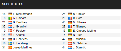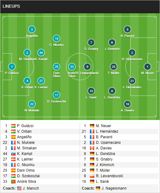 Như vậy là chỉ có Upamecano được đá chính trong đội hình của Bayern Munich ở trận này để đối đầu CLB cũ, trong khi Sabitzer chỉ dự bị. Và nhìn vào đội hình ra sân của 2 đội, có thể thấy sự khác biệt không nhỏ từ phía Hùm xám.