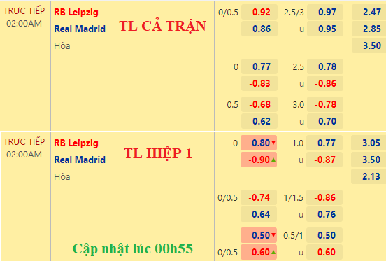 Trên sàn châu Á, RB Leipzig vẫn giữ được kèo chấp đồng banh dù điểm ăn ở mức bỏ. Trong khi tài xỉu vẫn là 2 3/4. Nhưng so với thời điểm mở kèo thì thực tế RB Leipzig vẫn tăng nhẹ.