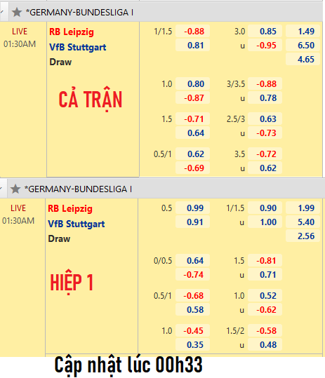 RB Leipzing không có đội hình mạnh nhất khi phải sử dụng nhiều cái tên còn rất mới ở danh sách đá chính. Điều này khiến đội chủ nhà sụt giảm đáng kể trên sàn giao dịch châu Á. Kèo chính đã kéo về sát mức chấp 1 hòa dù đầu phiên chấp 1 1/4 cùng lợi nhuận cân bằng giữa các lựa chọn đối lập.