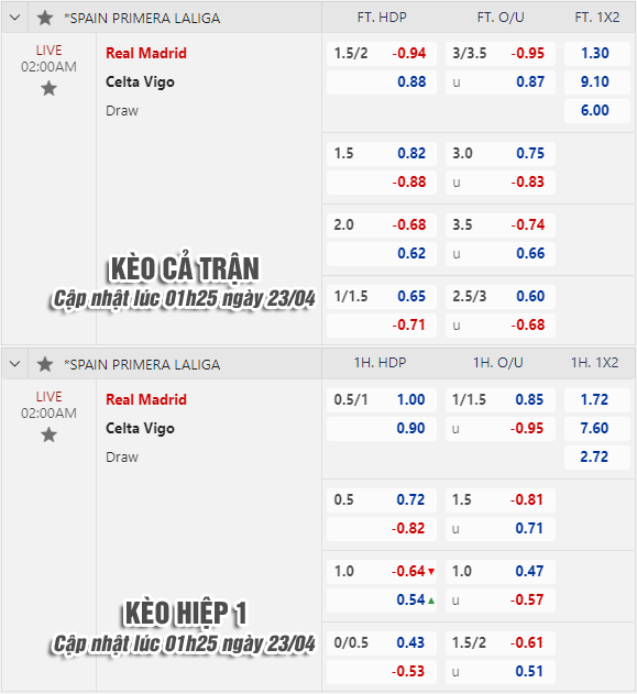 AEGoal chốt kèo bóng đá trực tiếp trận Real Madrid vs Celta Vigo diễn ra lúc 02h00 ngày 22/04/2023 trong khuôn khổ giải VĐQG Tây Ban Nha - La Liga sau khi dựa trên tính toán, chuyển động về kèo châu Á và đội hình ra sân của 2 đội.