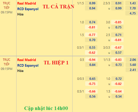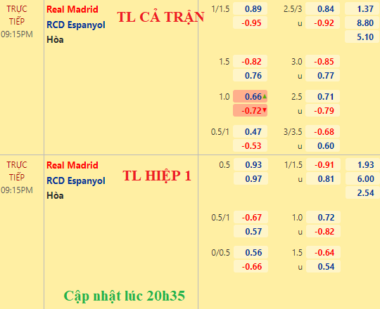 Dù chỉ sử dụng đội hình dự bị nhưng Real vẫn tăng giá. Kèo chấp 1 1/4 của họ ghi nhận điểm ăn ở cửa trên giảm, trong khi tài xỉu 2 3/4 cũng có lợi nhuận ở cửa tài giảm. Trên thực tế, Espanyol cũng hoàn toàn thoải mái về tâm lý khi đang ở vị trí an toàn, điều đó mang tới hy vọng về kịch bản mở trận này.