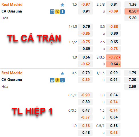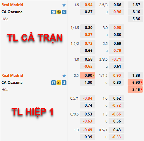 Tỷ lệ chấp chính của Real Madrid vẫn được nhà cái châu Á duy trì ở mức 1 1/2 ở thời điểm hiện tại, điểm ăn của cửa trên đã được điều chỉnh giảm so với trước đây nhưng không nhiều. Tỷ lệ tài xỉu của trận đâu cũng có những diễn biến xuôi chiều khi mốc 2 3/4 vẫn là mốc chính nhưng điểm ăn của cửa tài đã được điều chỉnh giảm.