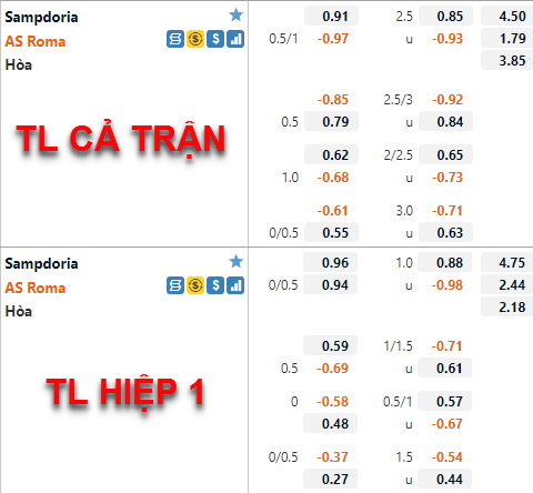 Tỷ lệ của AS Roma có xu hướng tăng điểm thời gian vừa qua. Hiện tại đội khách đã có mức chấp chính 3/4 thay cho mức 1/2 ở lần chúng tôi cập nhật sáng nay. Tỷ lệ tài xỉu của trận đấu cũng có diễn biến tương tự khi mốc 2 3/4 đang dần được đẩy lên làm mốc chính thay cho mốc 2 1/2 trước đây